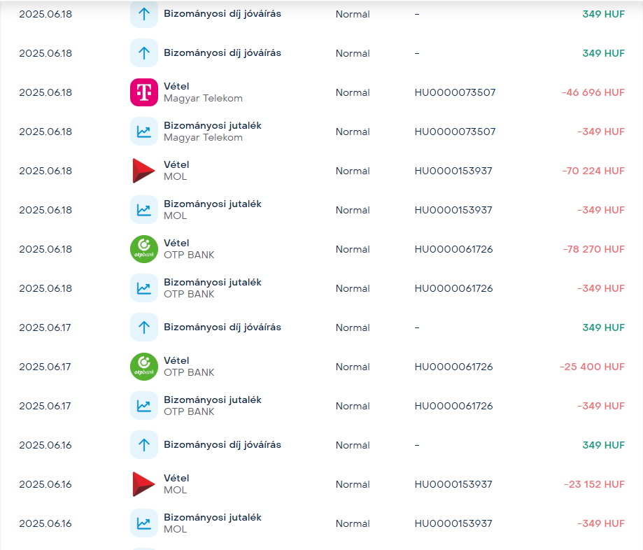 Végül nem sokkal később 25 400 forintos árfolyamon teljesült az első OTP megbízásom, és itt is azt tapasztaltam, hogy a 349 forintos bizományosi jutalékot jóváírják. Ezen felbuzdulva és látva, hogy az árfolyam épp lefelé mozgott, úgy döntöttem, hogy veszek még.